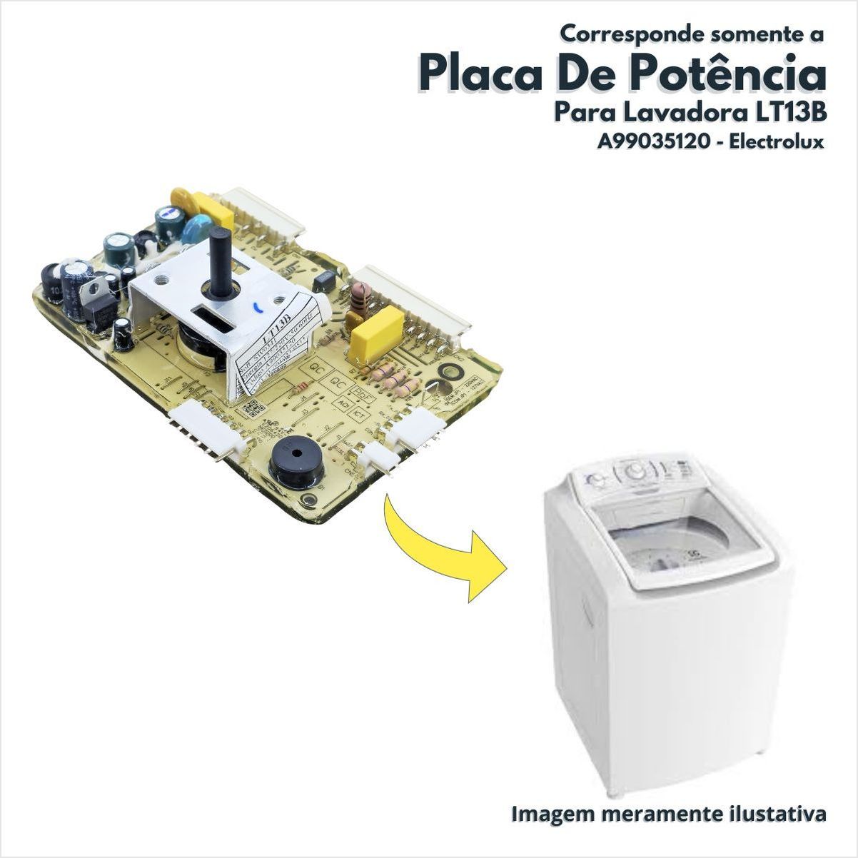 Marca: Electrolux Voltagem: Bivolt Compatibilidade: LT13B Código do Fabricante: A99035120 Modelo: Placa de Potência Medidas da embalagem: Altura 5cm, Largura 15cm, Profundidade 24cm